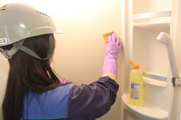 シャワールームを丁寧に清掃。利用者が気持ちよく汗を流せるように、清潔な空間を維持することは、健康や満足度にもつながる大切なお仕事!床や壁、排水口まがピカピカに仕上げると達成感もひとしお。