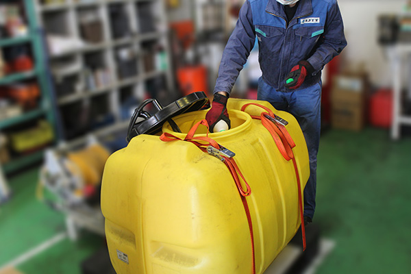 構内の雑草をしっかりお手入れするため、除草剤を準備中!「お仕事は段取り八分、仕事二分」の言葉通り、準備がバッチリだと次の作業がスムーズに運べます。除草剤は扱いに注意が必要なので、安全第一で丁寧に準備しています。