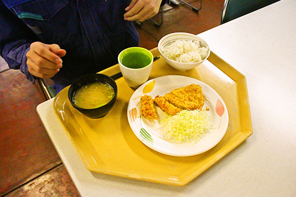 本日のお昼ご飯は、会社の食堂で豚肉のコーンフレーク揚げ定食!おいしいランチで英気を養って、午後からのお仕事も元気に頑張りましょう!