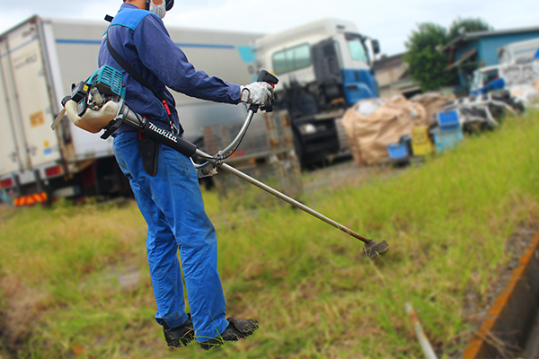 午後からは草刈り作業!草刈機を背負い、広い構内を歩きながら雑草を刈り取り、きれいに整えます。雑草を刈ることで、構内がスッキリするだけでなく、気分もリフレッシュ!みんなが気持ちよく過ごせる環境づくりに貢献します!