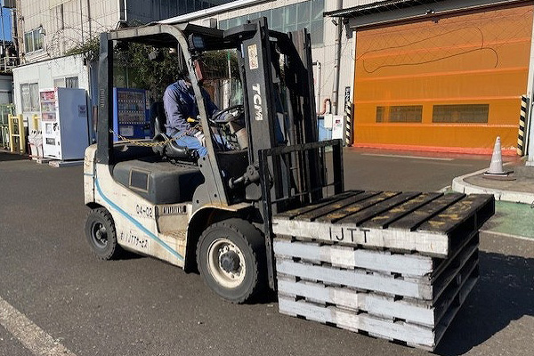 フォークリフトを運転して、工場で使用した木製パレットの整理整頓を行います。安全運転をすることはもちろん、工場の運営がスムーズに進むよう、日頃から整理整頓をしっかりと心掛けています!